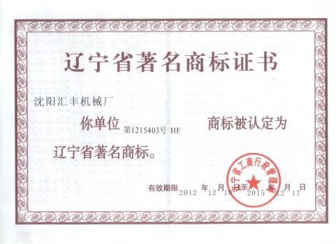 沈陽匯豐機械廠于2012年獲得“遼寧省著名商標”